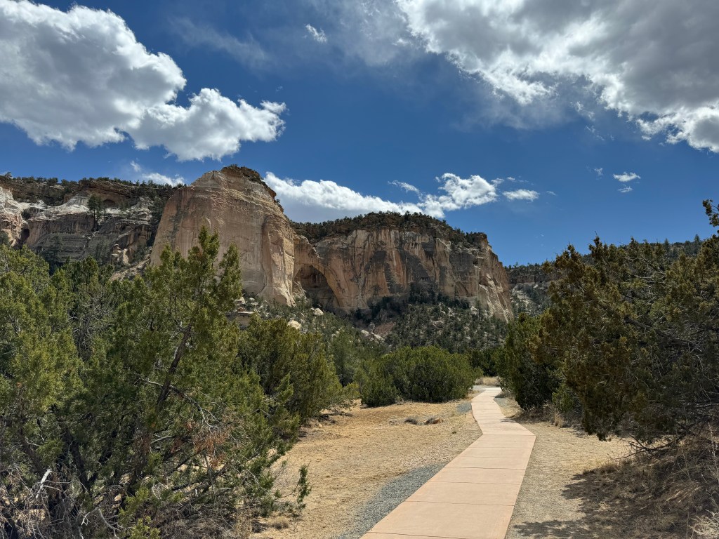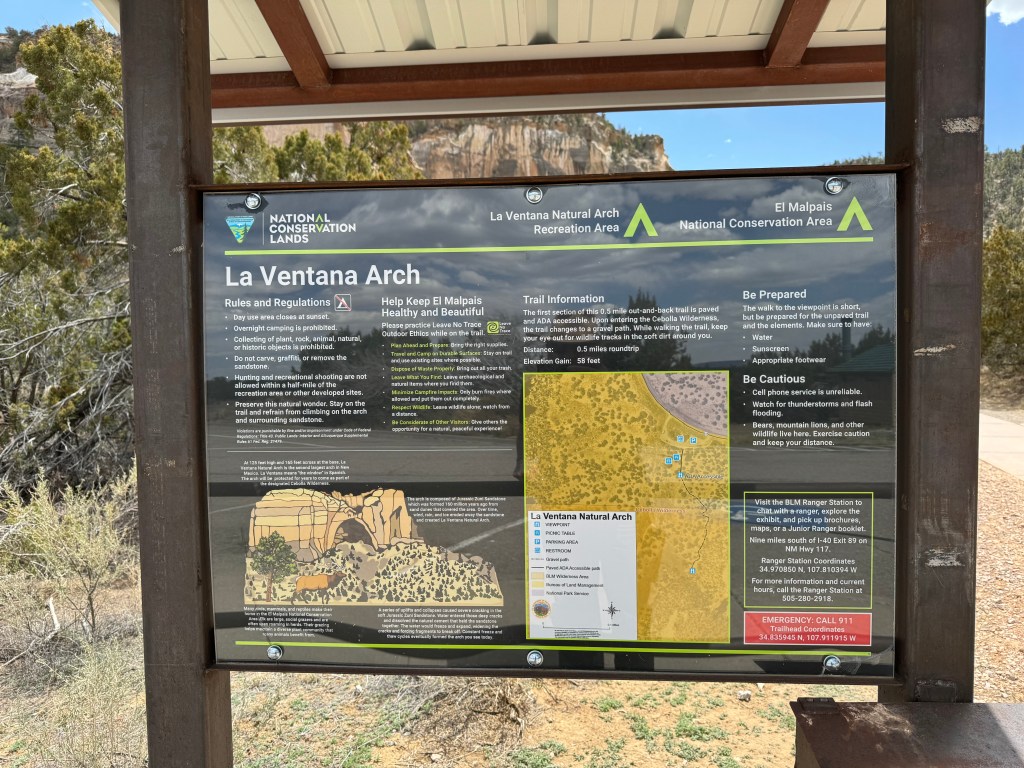 We were out of cell service so I was just keeping an eye open, and saw a sign for La Ventana Natural Arch in 15 miles and figured, why not, that’s the stop! I pulled off at the trailhead and much to my surprise you could actually see the arch from the trailhead. It’s a short 15 minute walk up the trail (which does allow pets), and you’re standing at the base of a gigantic, natural sandstone arch – one of New Mexico’s largest.