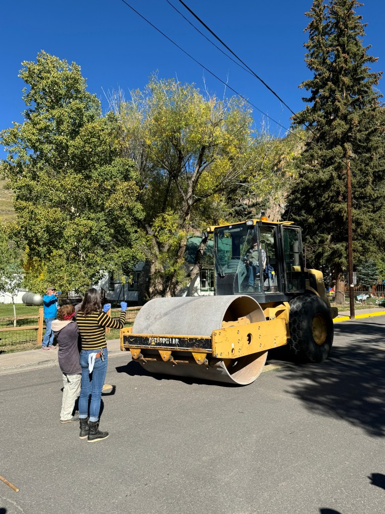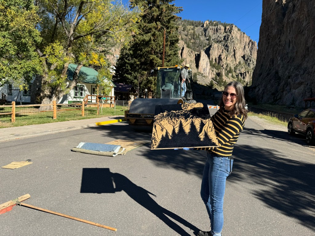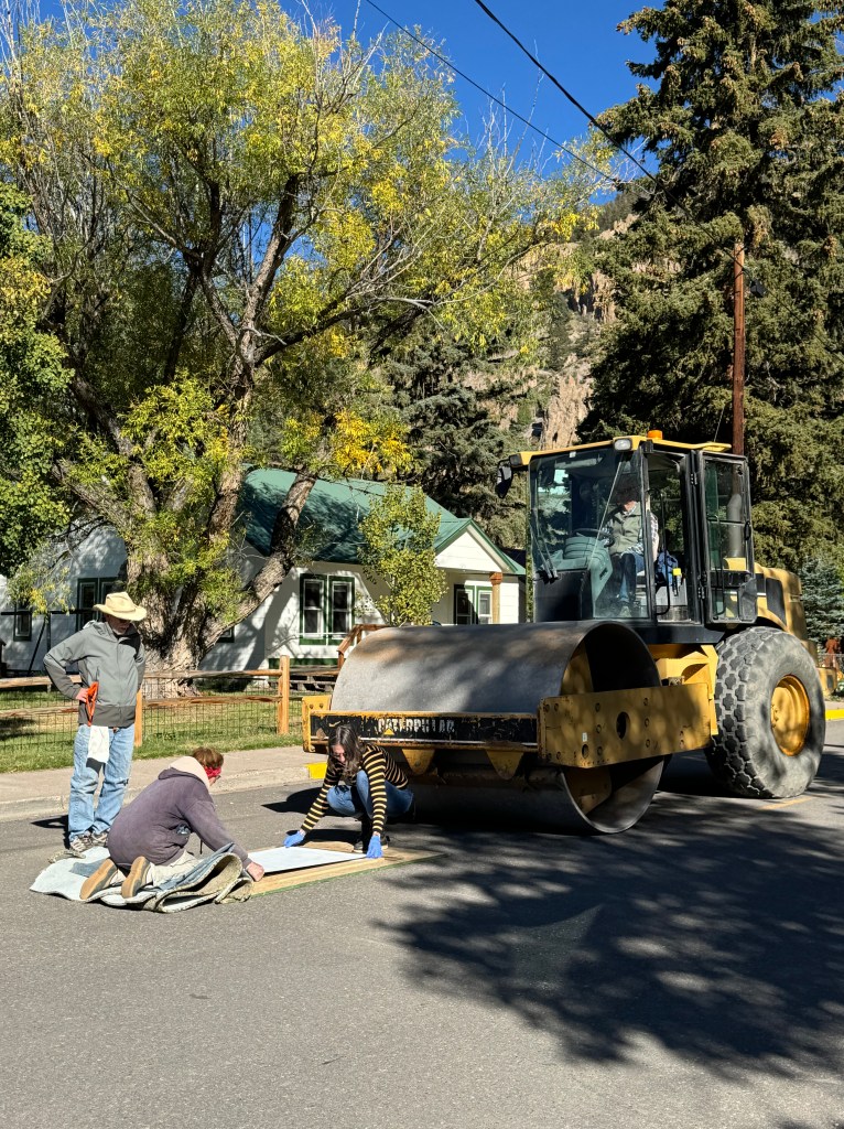 It was all hands on deck for the Creede Arts Council Steamroller Printmaking event. The show takes place yearly at the top of Main Street during the Cruisin the Canyon Car Show. The supplies and steamroller showed up on Main Street around 8:00 a.m. to be ready for action by 9:00. This was my second year submitting a piece for the event and my first year attending and attempting to lend a hand. Last year I tried doing a waterfall landscape but to be honest I prefer more irreverent pop art so this year I submitted my “Dolly For President” artwork. There are no parameters for the submission beyond using a wood board for the printing and there was a nice variety of art available from local artists.