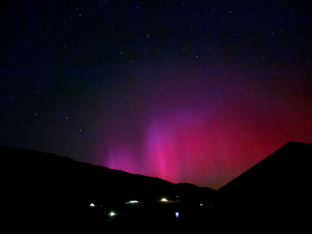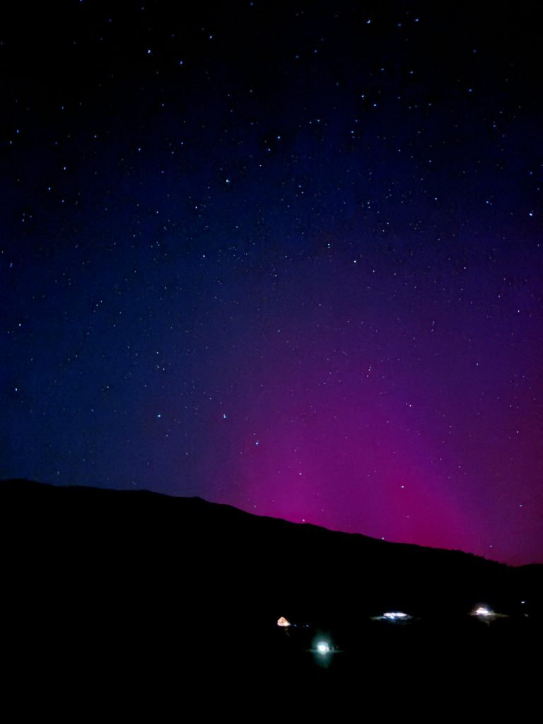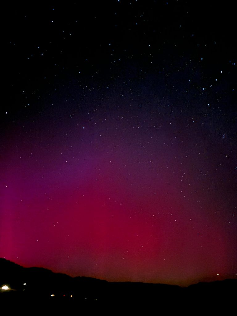I went outside around 8:30, after the moon had set, to catch the Draconids meteor shower and was caught by surprise when I noticed a pink light on the horizon. I ran back inside to grab my phone knowing that it would be able to pick up more light and color than my eyes could.