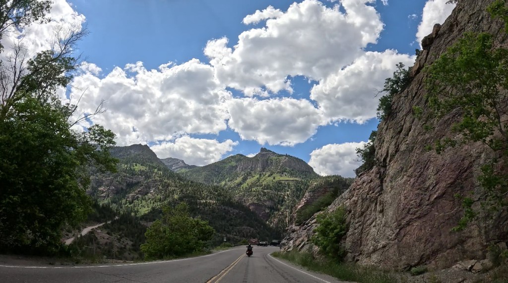 On our first day heading towards Montana, Kyle and I left Creede while it was still in the low 50’s and by the time we made it through the canyon it had warmed up considerably. Our first stop was at the Durango Harley Davidson to pick up some all-weather gloves because being on a bike for 2 weeks leaves you at the mercy of the elements and we wanted to be prepared for the cold and rain we were sure to encounter. After our gear stop we started our trek over the million dollar highway and we were lucky that there was not a ton of traffic over this scenic byway on this particular afternoon.
