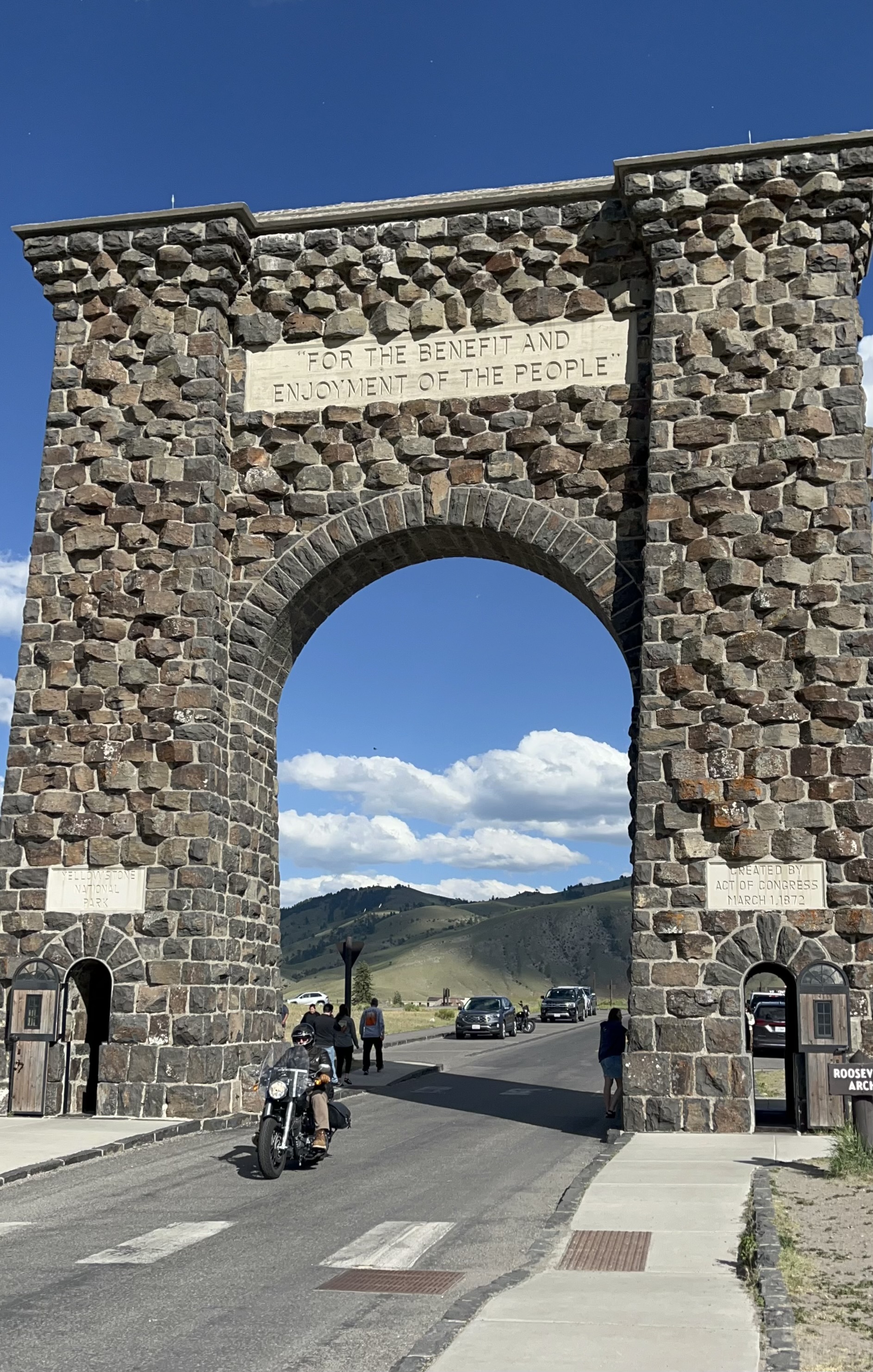 The weather mostly cleared up so we started heading our way south east towards Yellowstone National Park. We enjoyed riding through the beautiful countryside and took our time getting to Mammoth, Wyoming. We passed through the Roosevelt Arch in Gardiner, Montana, and crossed the border of Wyoming and headed right to the Mammoth Hot Springs.