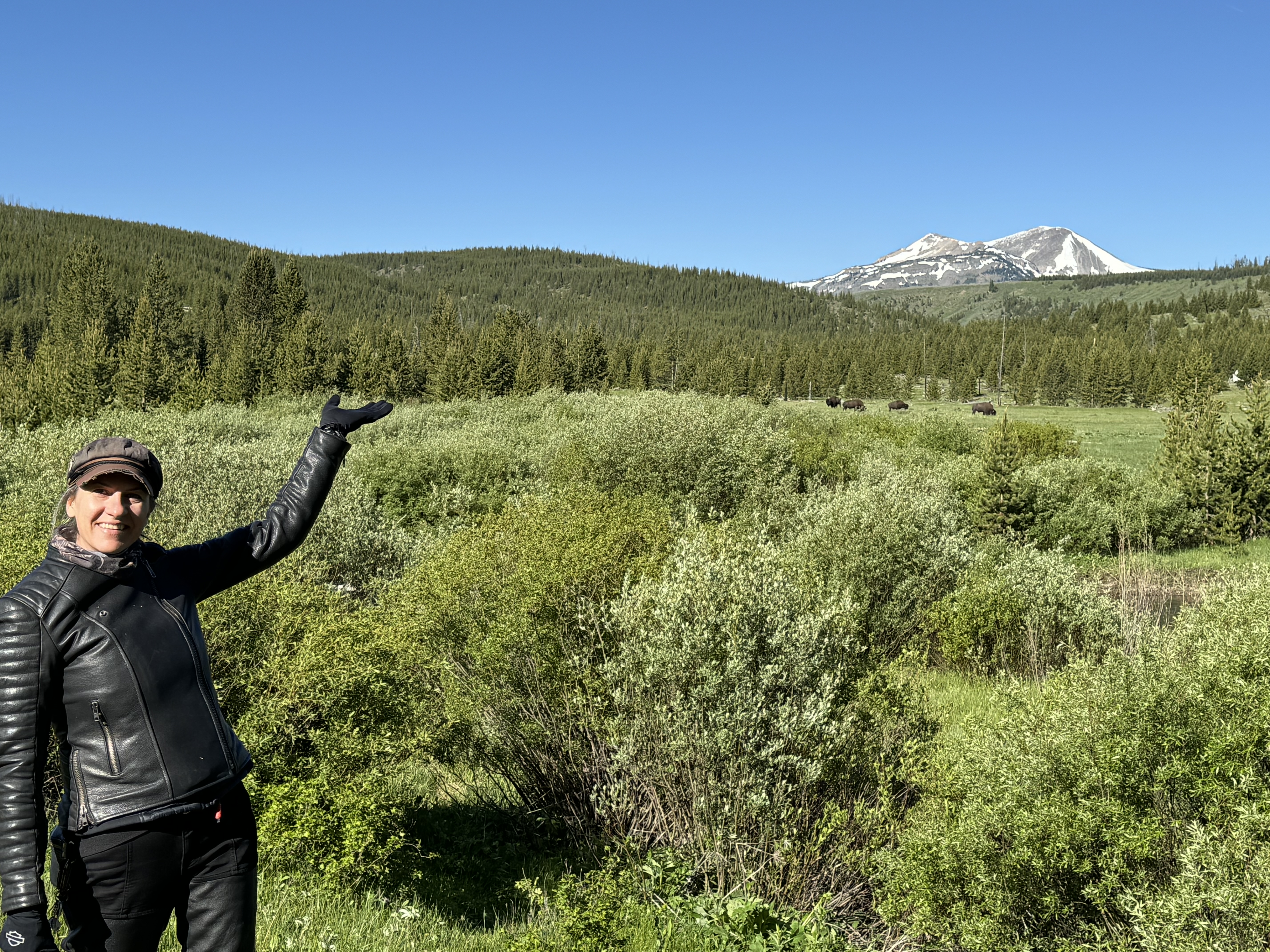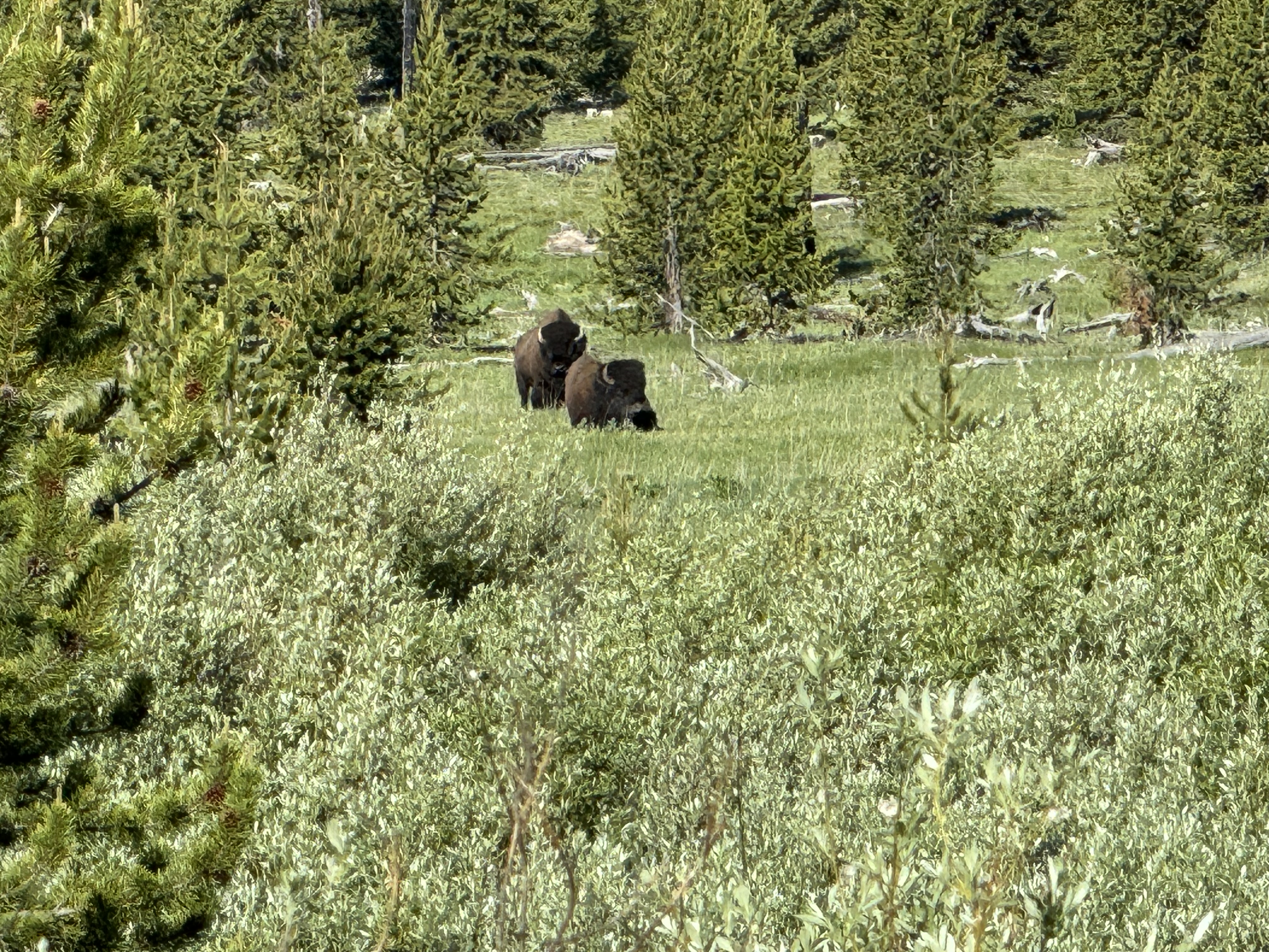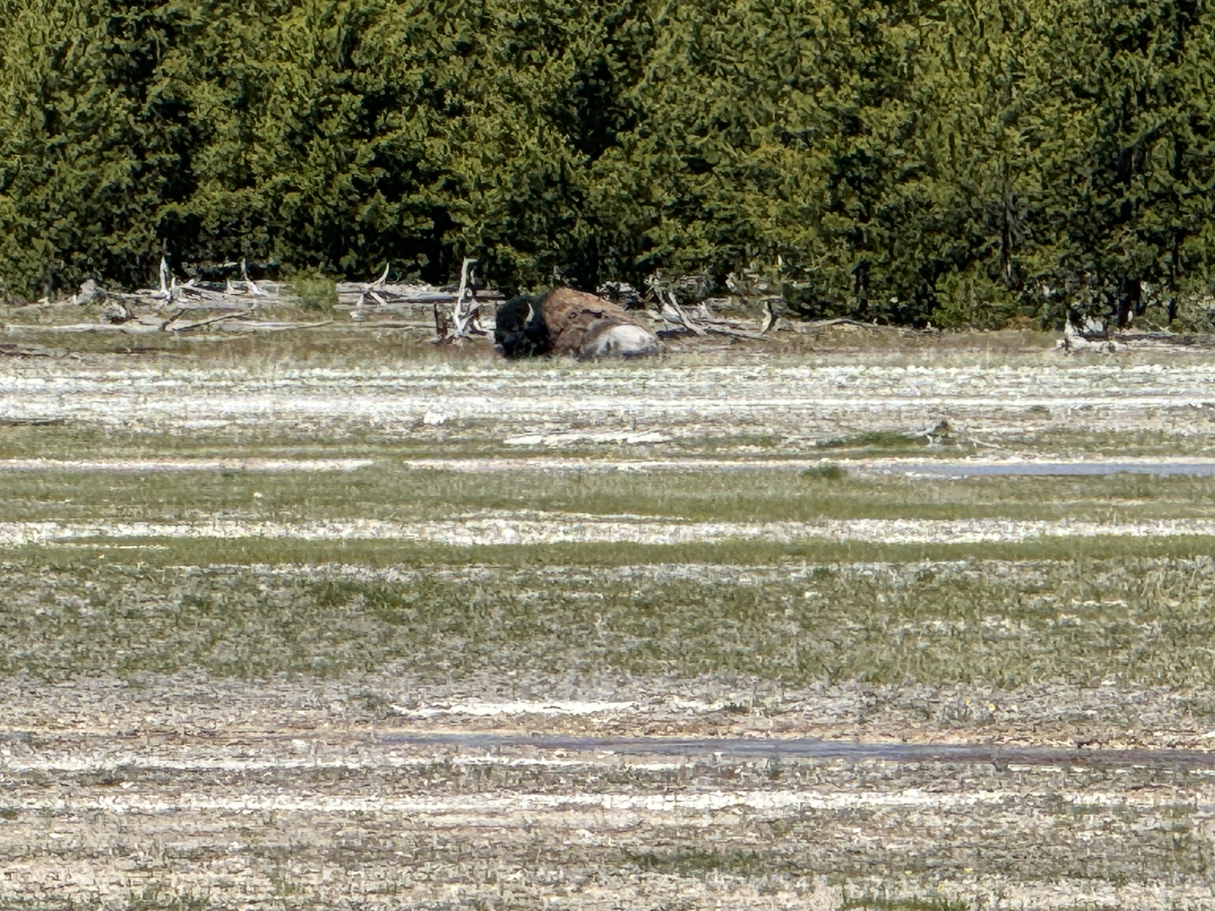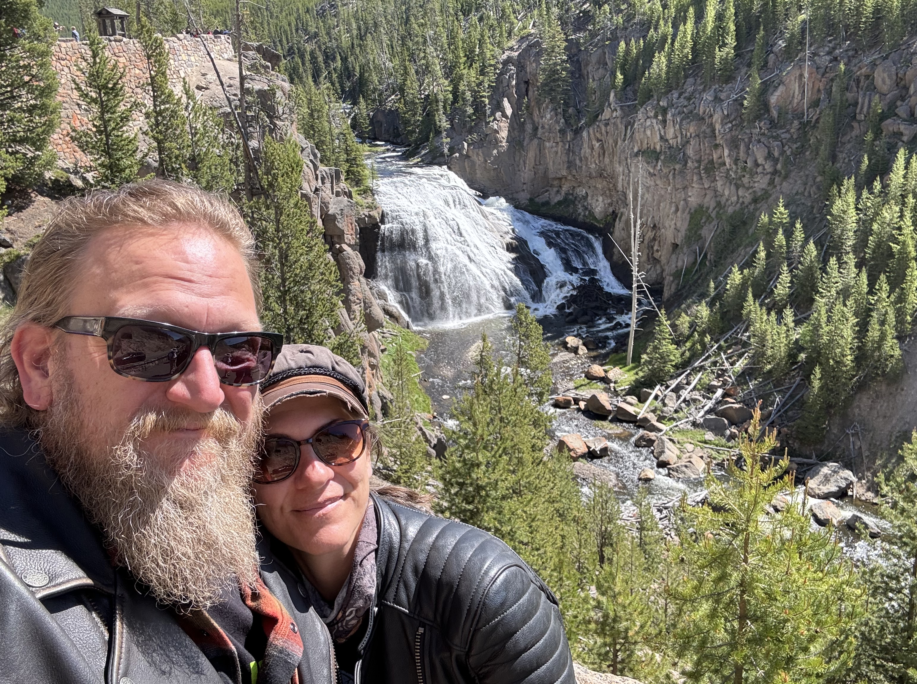We started out on our bikes early in the morning and dropped back into Wyoming and into Yellowstone National Park. We beat the morning crowds and bypassed Mammoth Hot Springs since we’d already seen them the day before, and enjoyed the beautiful roads and riding through the national park. We made plenty of stops on the way, watched some buffalo roll in the dirt, stopped at waterfalls on the way, ultimately making our way into the thermal areas.