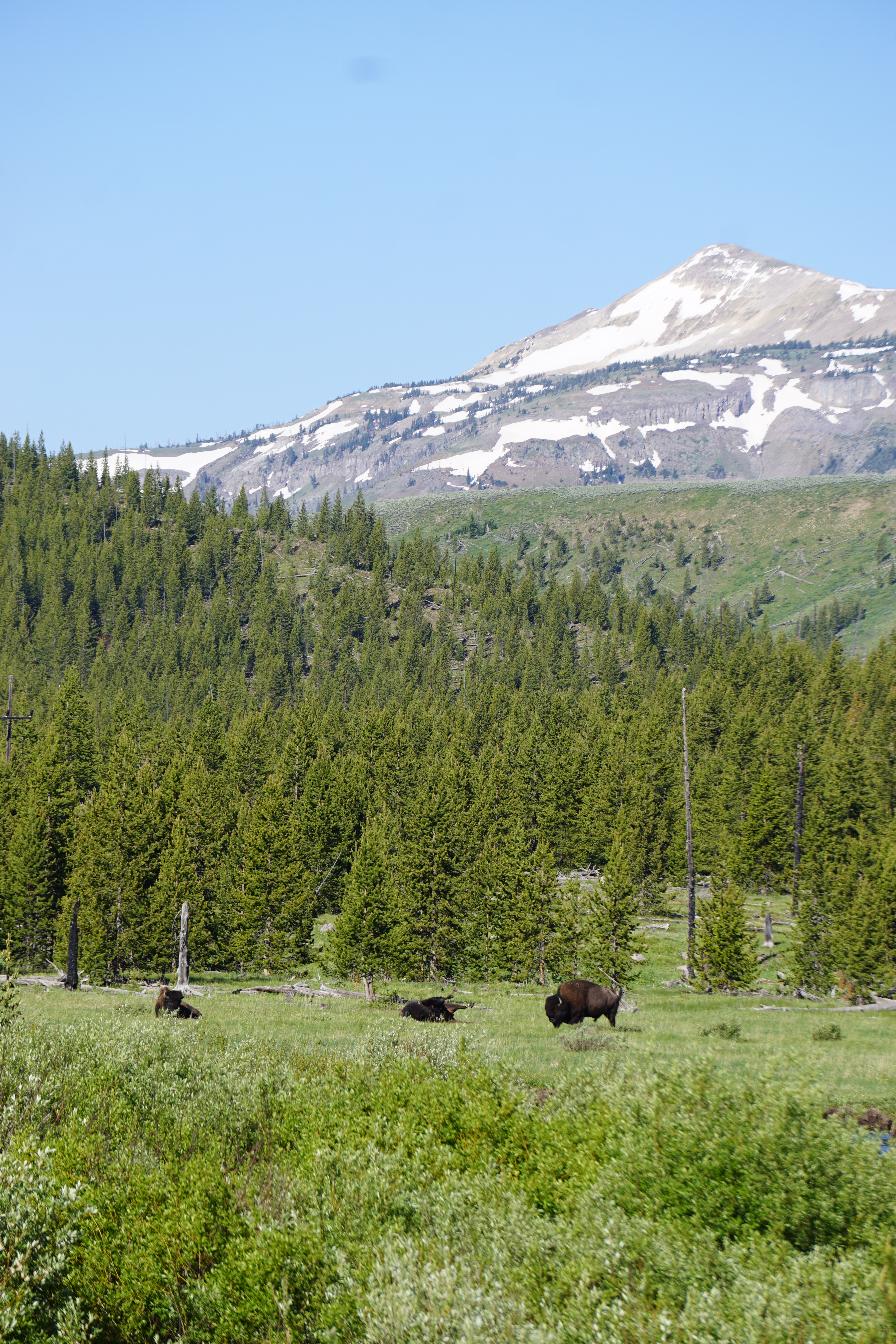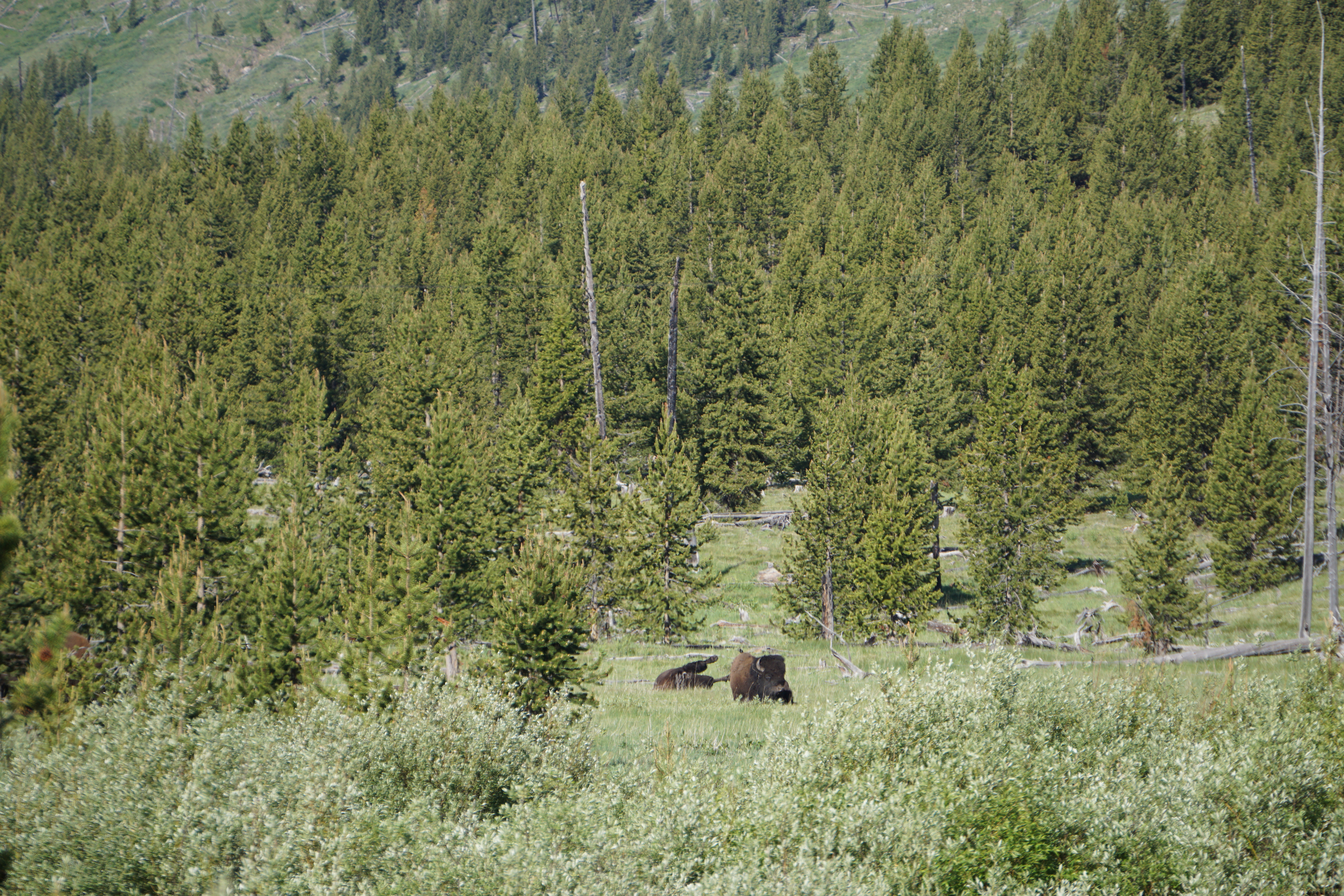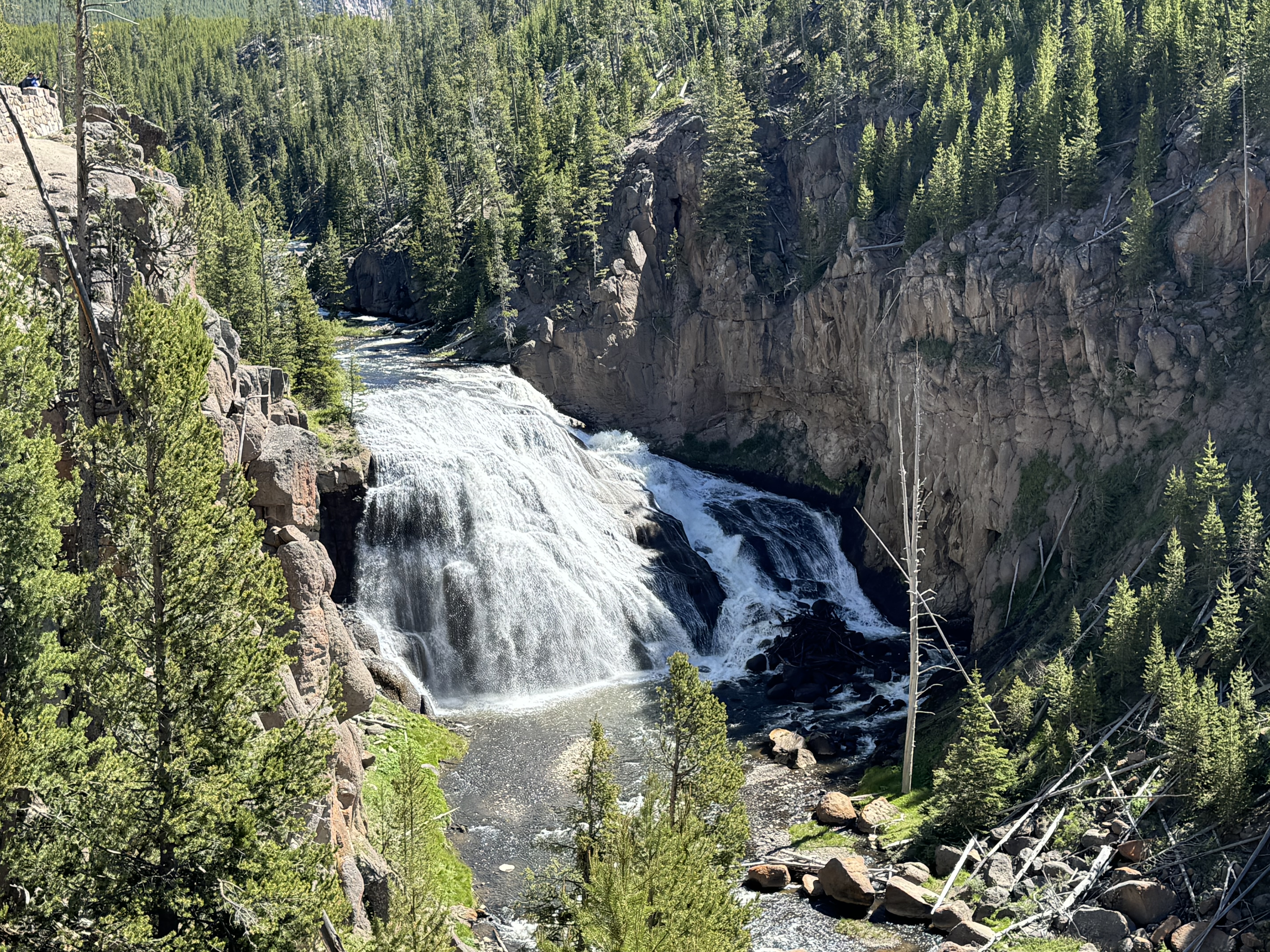 We started out on our bikes early in the morning and dropped back into Wyoming and into Yellowstone National Park. We beat the morning crowds and bypassed Mammoth Hot Springs since we’d already seen them the day before, and enjoyed the beautiful roads and riding through the national park. We made plenty of stops on the way, watched some buffalo roll in the dirt, stopped at waterfalls on the way, ultimately making our way into the thermal areas.