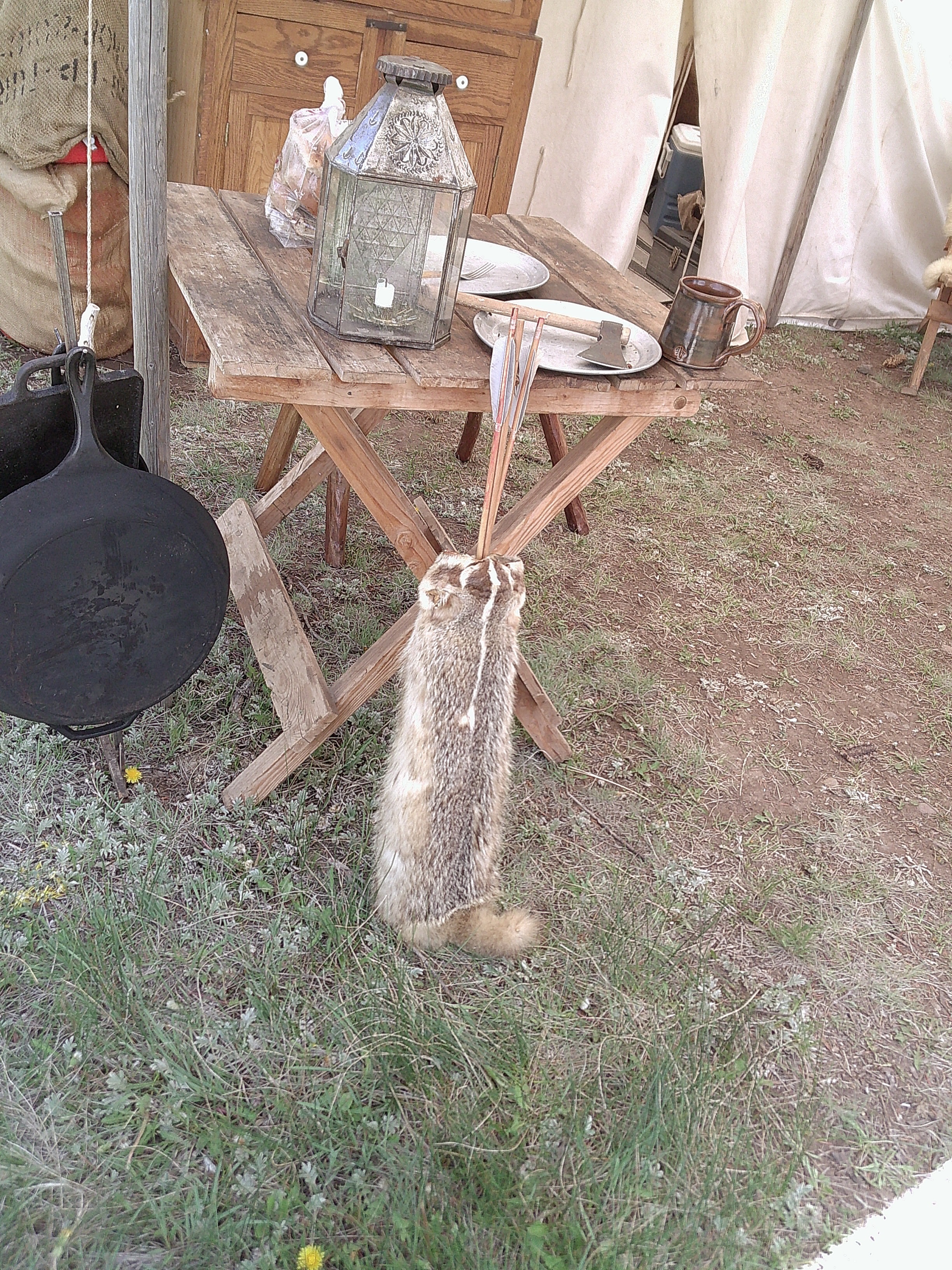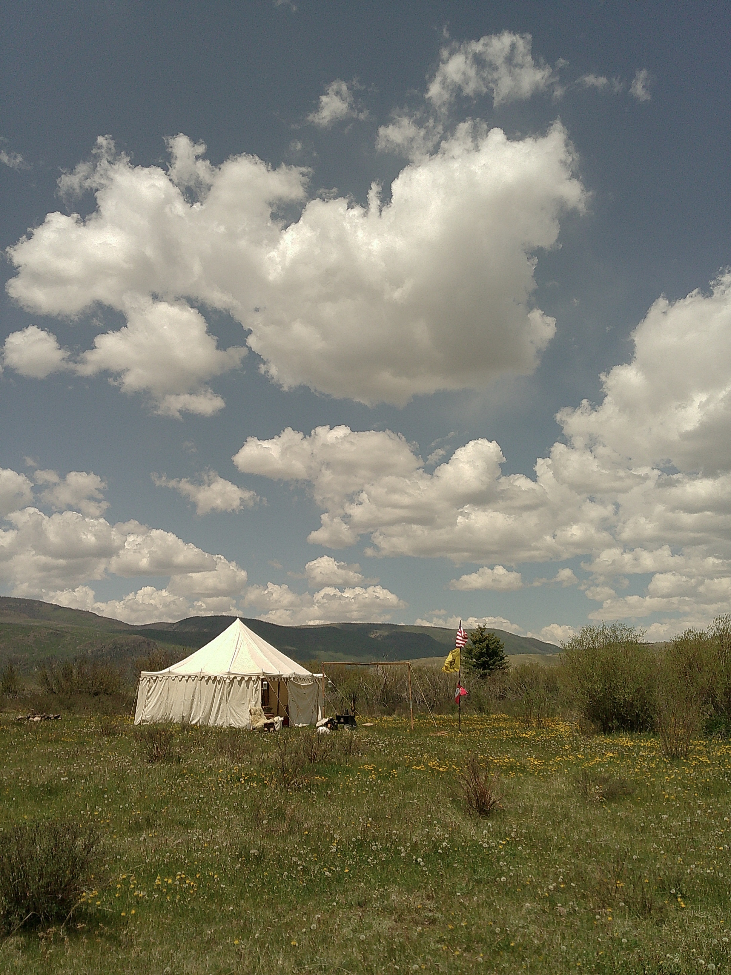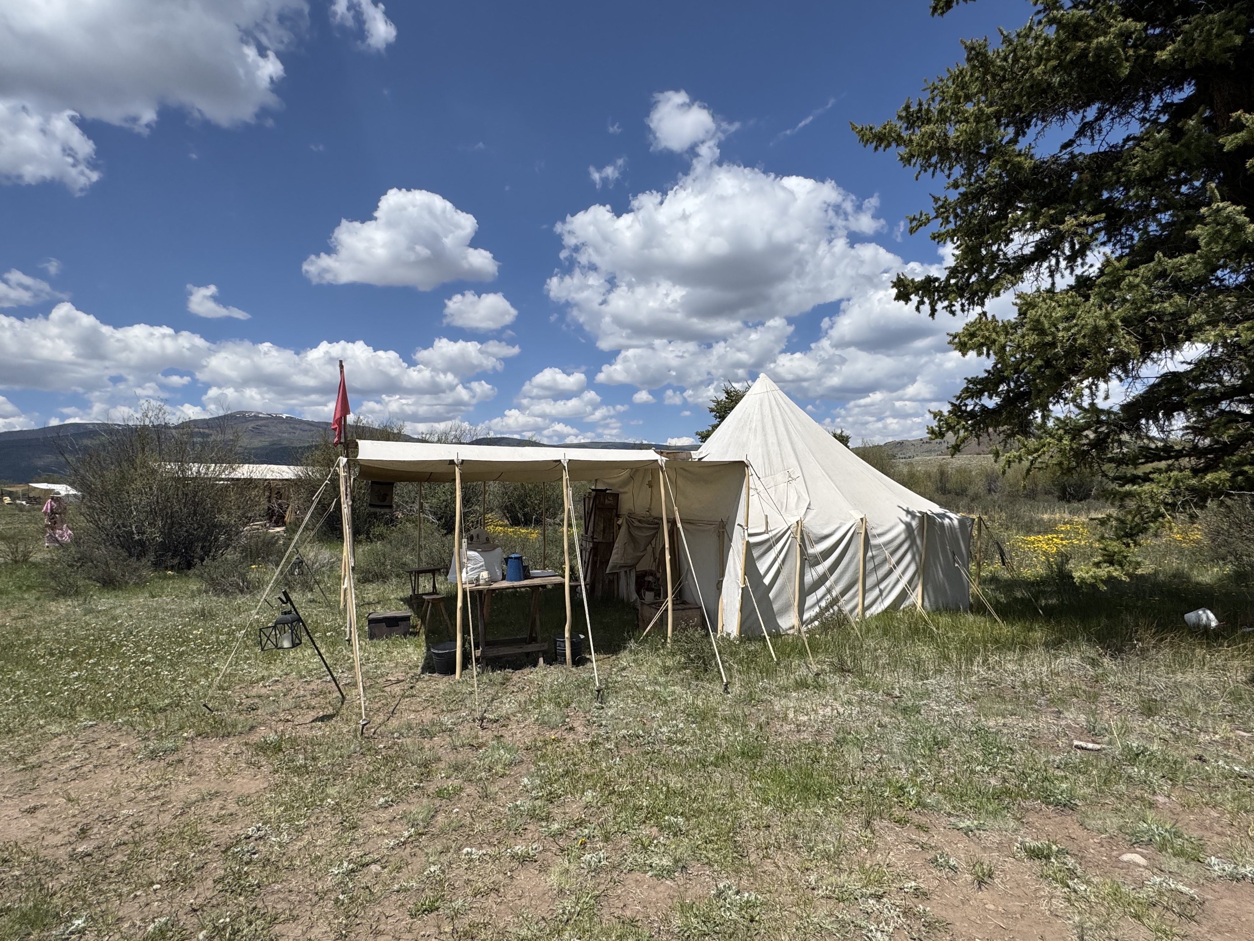 The nice thing about this rendezvous being so close to home is I was able to pop in and out through the week and still work my day job. I went in the first day of the weeklong rendezvous to get the lay of the land, said hello to everybody, and checked out the short-term camping situation. I acquired a canvas wedge tent, but I had not yet waterproofed it…and of course, every afternoon that week it rained!