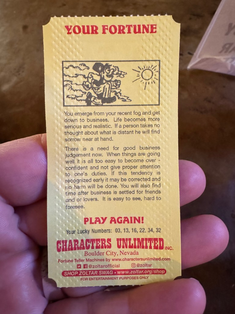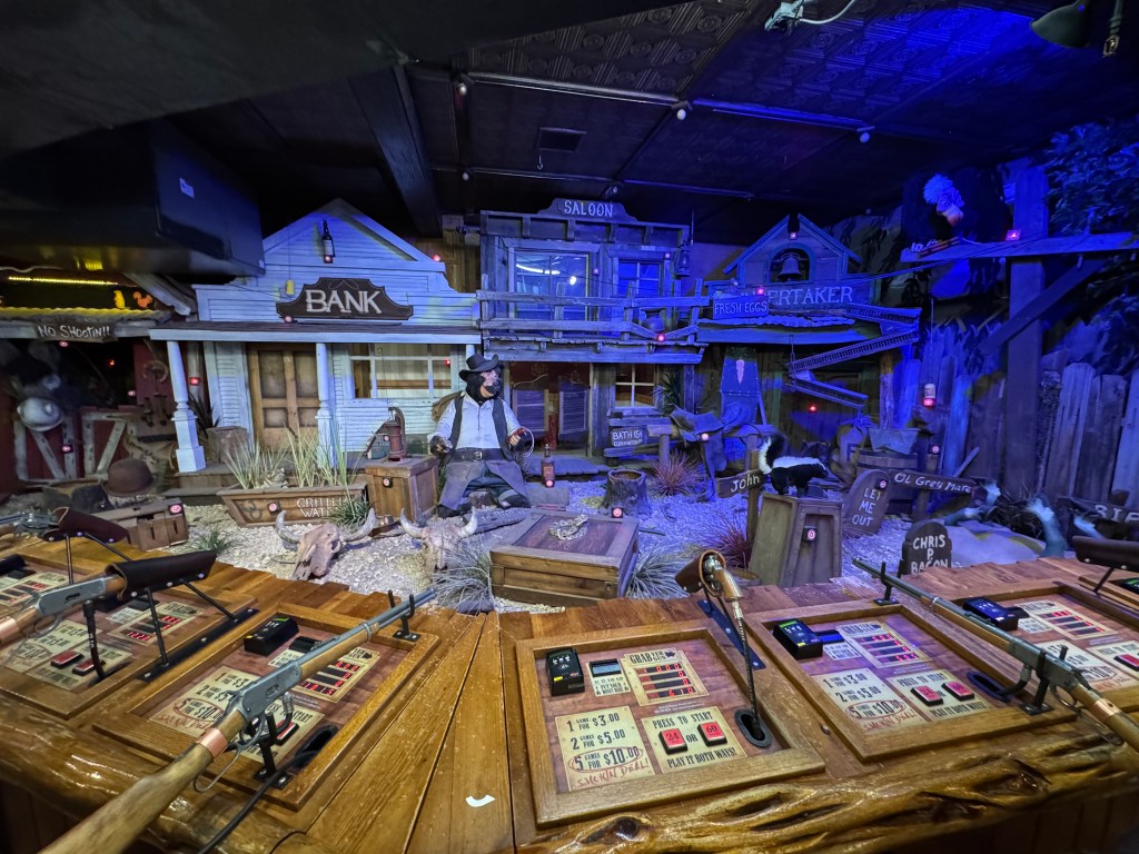Dinner was good and fast, and I took a spin around the gift shop, past the shooting galleys, had my fortune read, and headed to the bar for a nightcap.