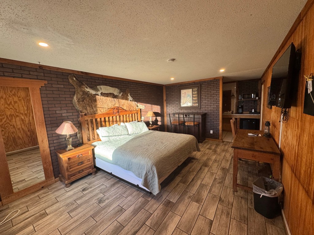 I was planning my stop for the night and looked for a hotel near the restaurant, and to my suprise the Big Texan Motel came up! It was very reasonable, and only a walk across the parking lot from the rooms to the steakhouse. I arrived in Amarillo and checked in and headed to my digs for the night. The room was clean and decorated in what I can only assume was “Big Texan” style.