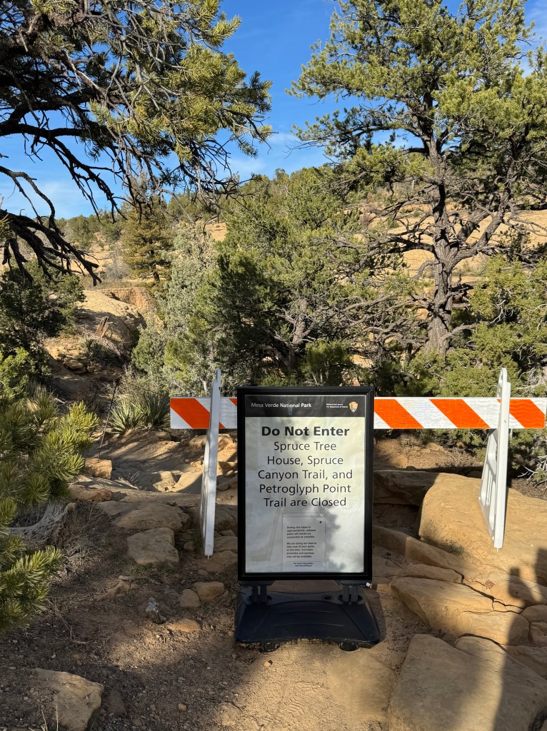 We grabbed some lunch in Cortez (Delicious, but insane portion sizes Loungin’ Lizard!) and headed to the park entrance. We were surprised to find there was a park ranger manning the gate, they were not collecting entrance fees or checking park passes, and he informed us most of the roads in the park were closed except the main route. All the museums, visitor centers, and guided tours of the cliff dwellings were shut down, however you could still visit the Spruce Tree House.