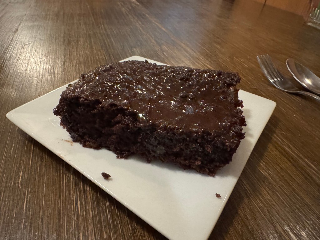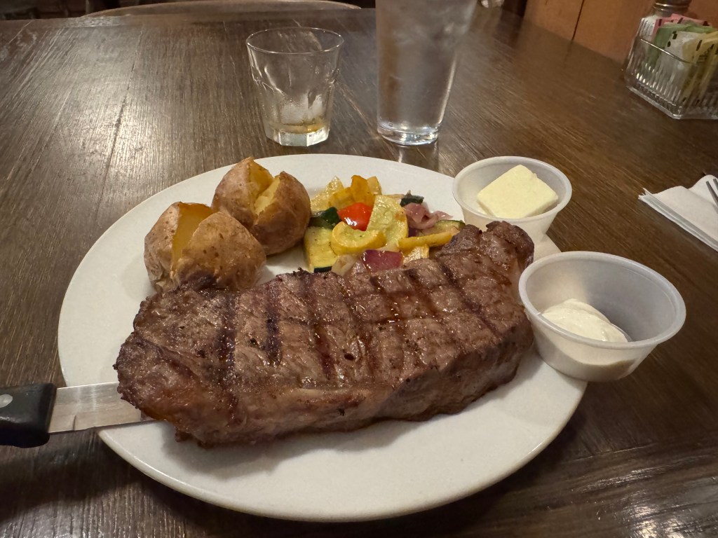 I was seated and ordered the NY strip steak ($26!?!?) and enjoyed the atmosphere (pretty sure there are a few bullet holes in the ceiling), then enjoyed my meal! I asked about the pie I saw other tables feasting on, but unfortunately they had just run out so I ordered the Texas sheet cake instead. So I have never had this before…and I do not know if this was a standard example or something special…but Wow! I retreated back to my room with a full belly and hit the hay, back on the road in the morning!
