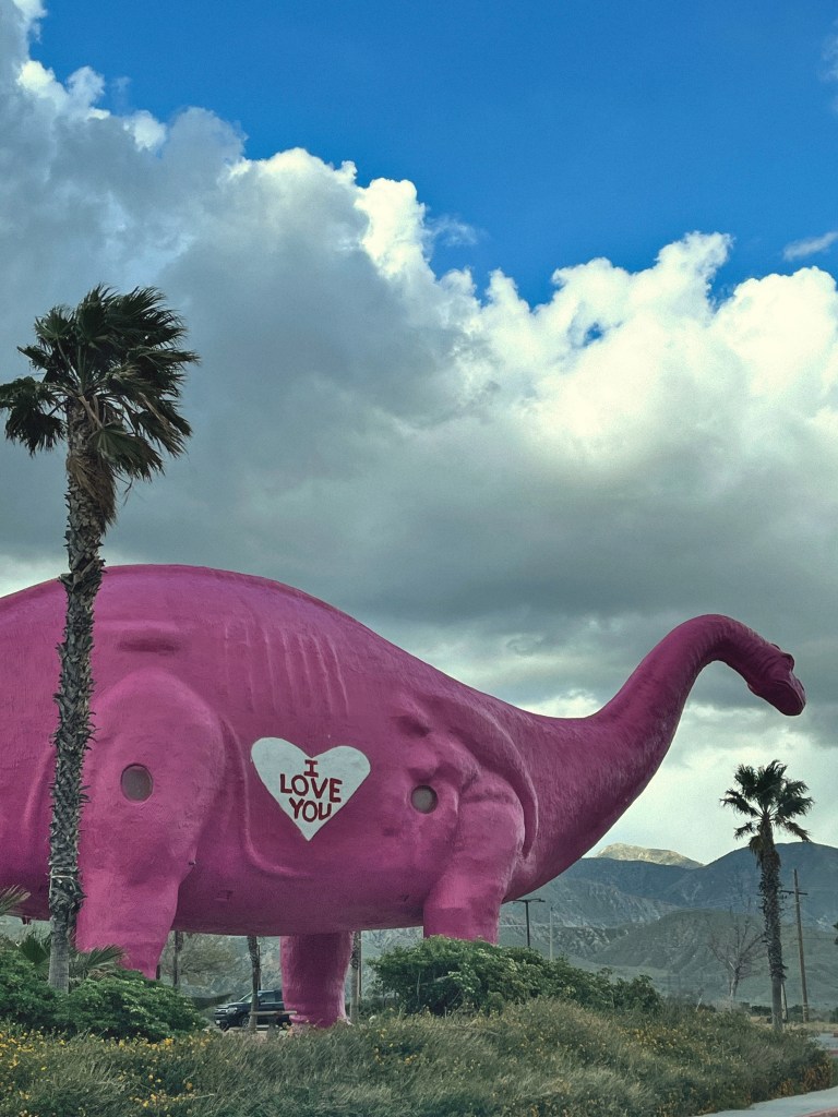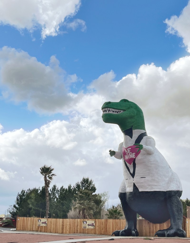 First things first. Whenever I am passing by the Cabazon dinosaurs I have to stop, it’s tradition. I can’t tell you how many times I have stopped there. We used to stop at the Wheel Inn for lunch on our way back from desert camping trips, but sadly the restaurant was closed in 2013 and shortly after torn down. This was the restaurant the Large Marge dropped Peewee Herman off at in Peewee’s Big Adventure. The sign remains but behind it is a pile of rubble. Even though the restaurant is gone I still stop because the last few years they have been painting the dinosaurs for the holidays, I’ve seen them painted like Fred Flintstone and Dino, Santa Claus and Rudolph, this trip they were still painted for Valentines day.