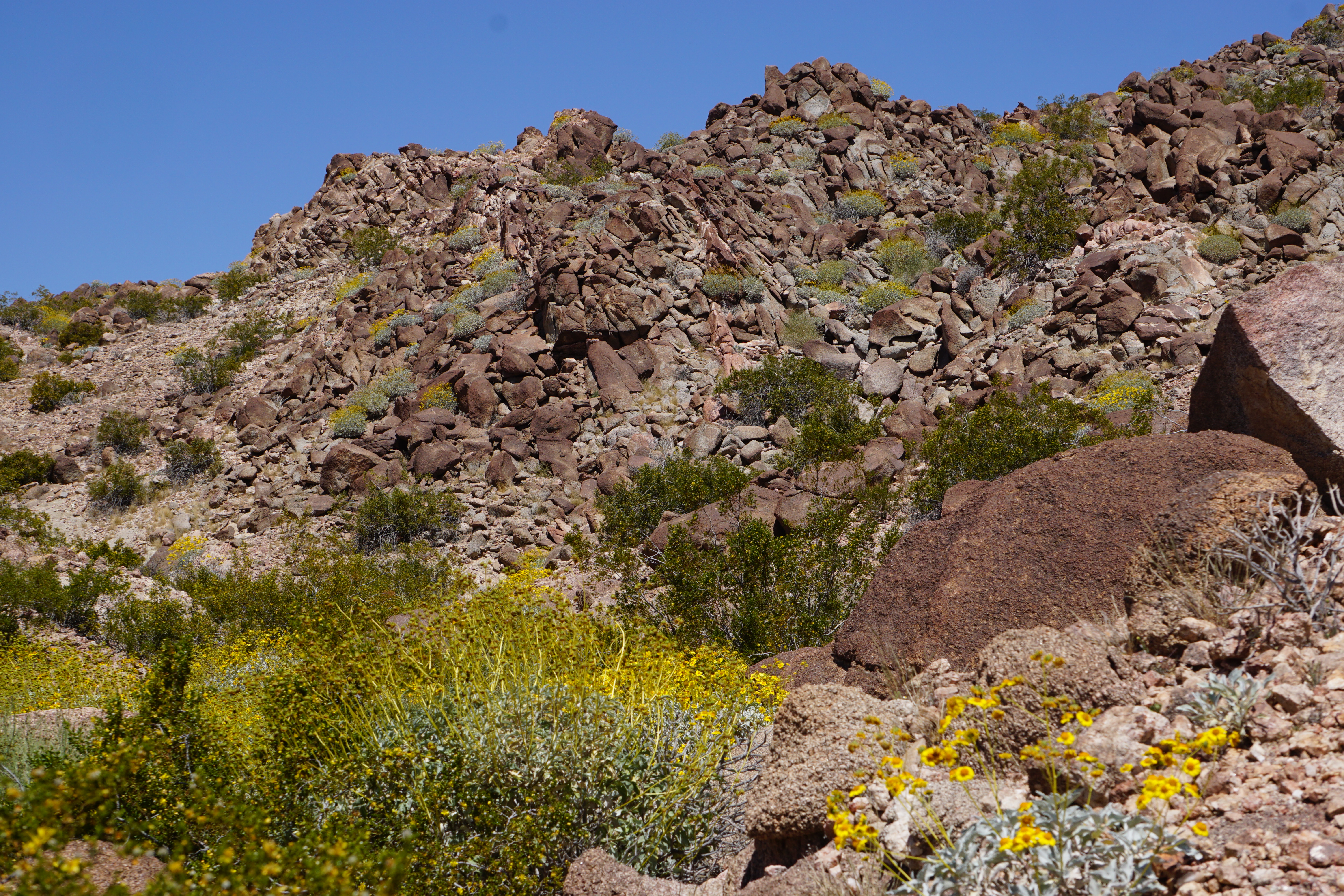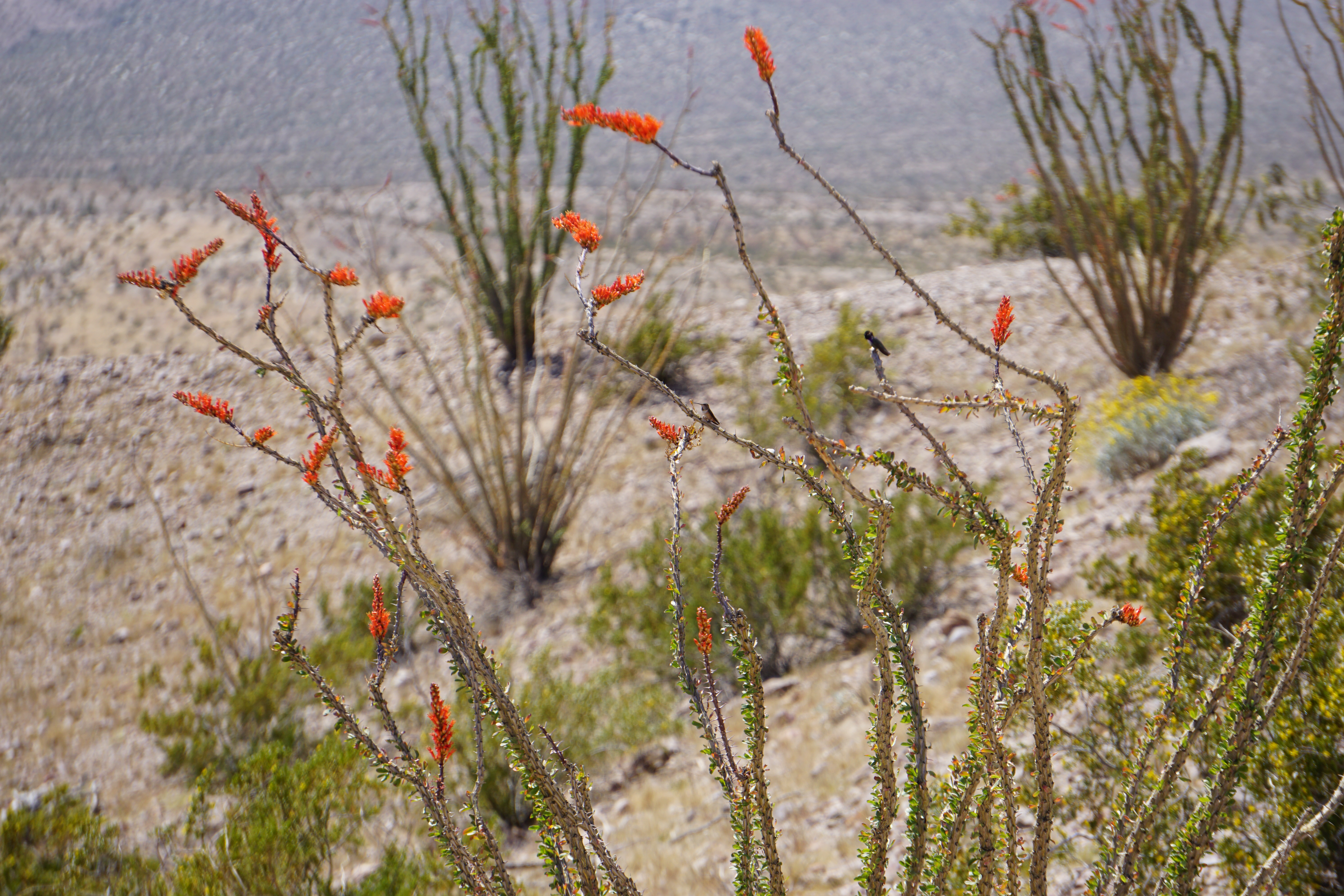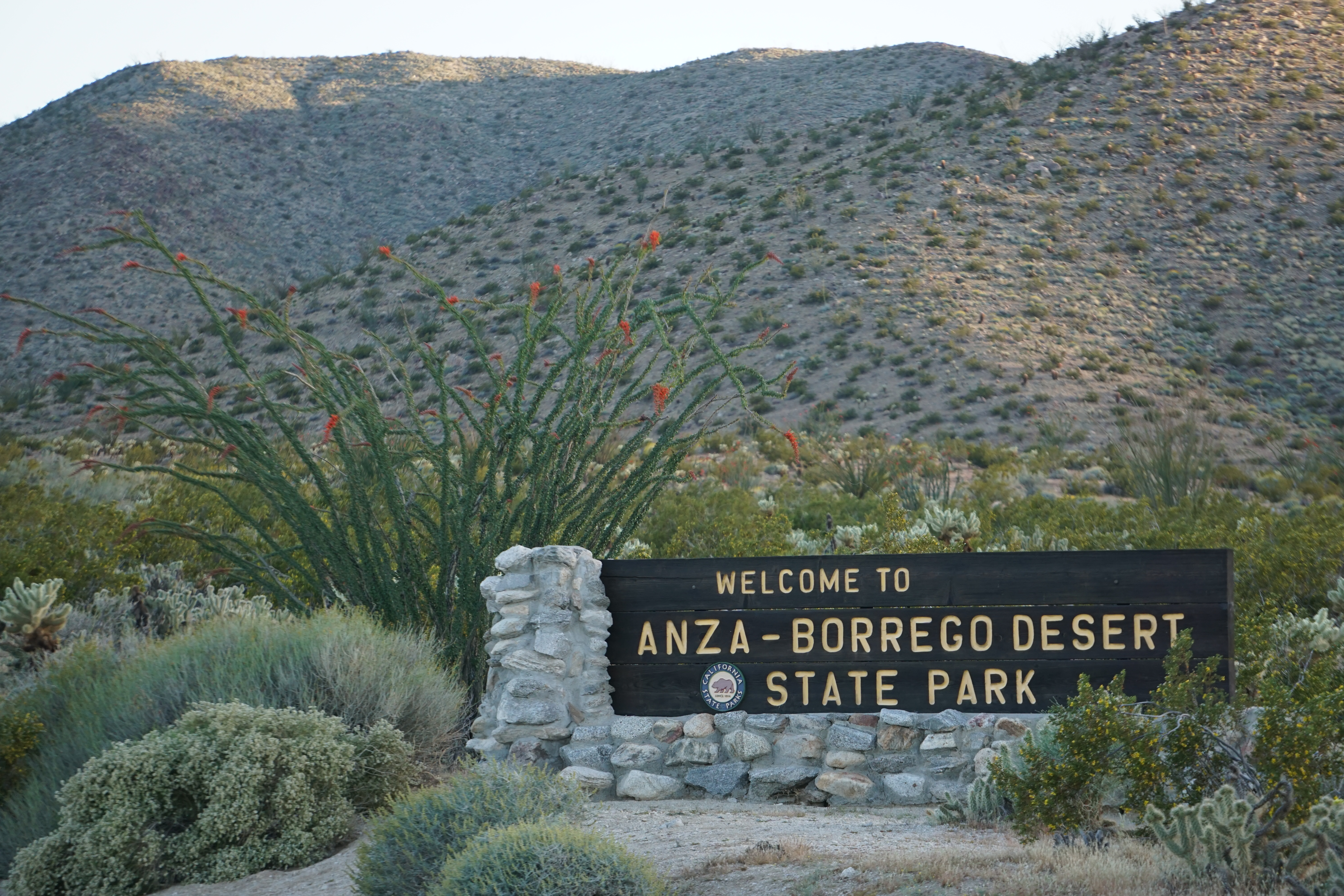I spent the first night at Tamarisk Grove Campground. I snagged the last spot there after I was turned away from the Borrego Palm Canyon campground whose 120 spaces were sold out. I set up camp and ate dinner out of the back of my car. The campground was quiet and I got a good nights sleep. The next morning I went to a part of Galleta Meadows that I’d never been to and then hiked around Slot Canyon. I was a few weeks late for the first desert blooms but there was still a lot of color to be seen.